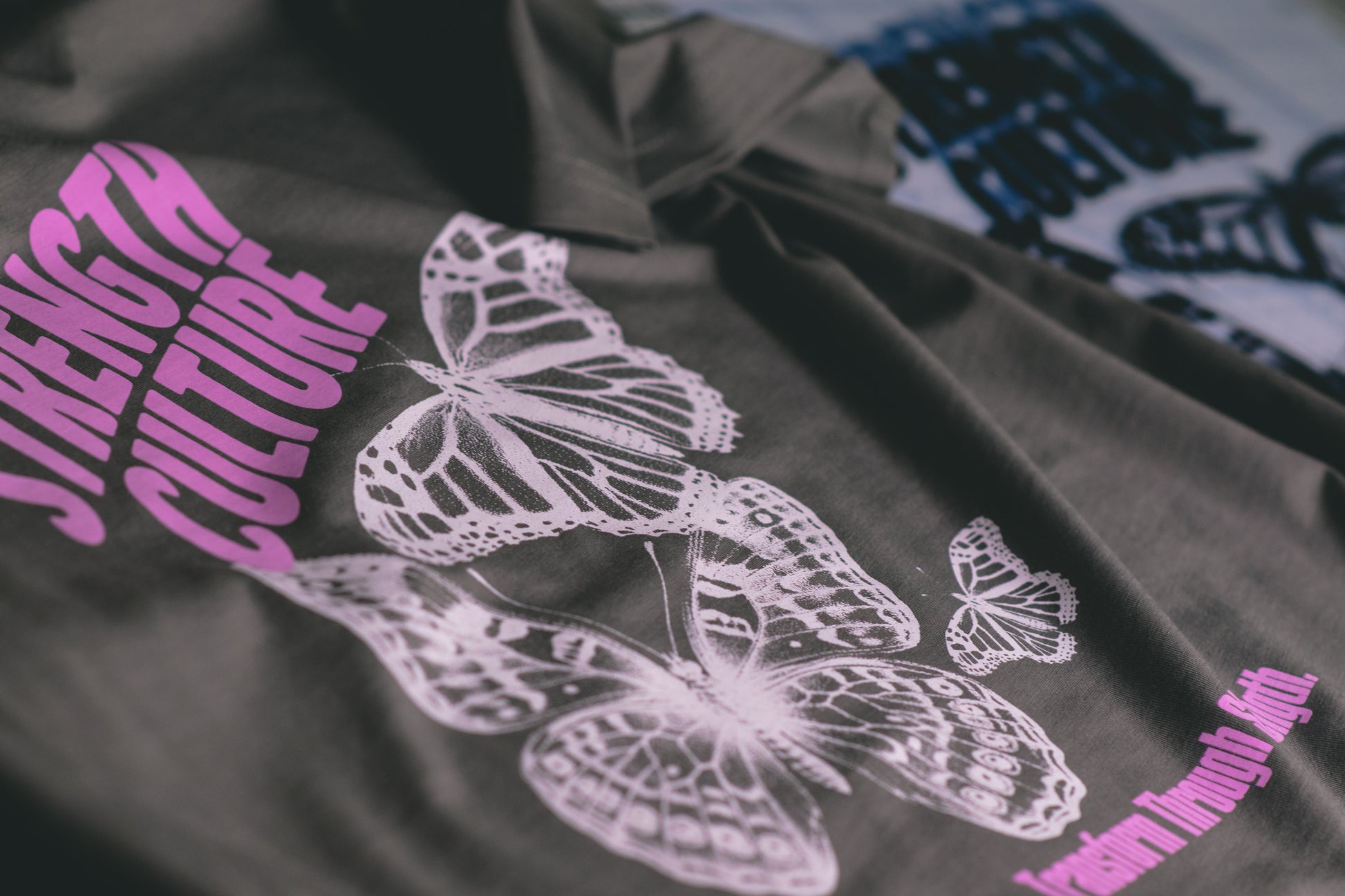 The Transform Through Strength. tee embodies your fitness evolution with a striking two-color hand screen-printed design. Featuring bold "Strength Culture" and "Transform Through Strength" lettering alongside butterfly imagery, this shirt symbolizes transformation and progress. It honors the relentless effort and commitment that drive your growth and strength gains in the gym, serving as a powerful reminder of your dedication to continual improvement.